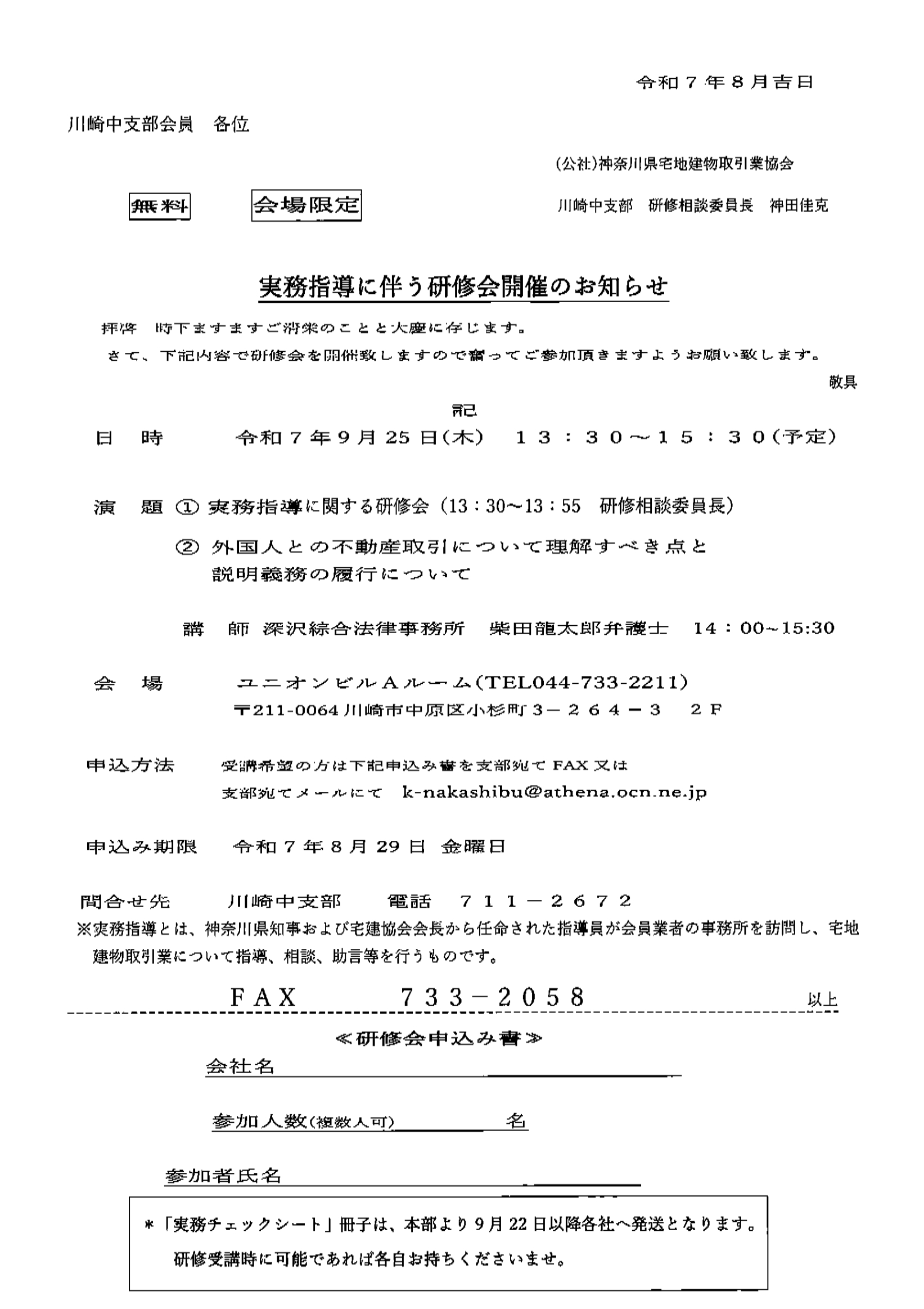 【川崎中支部】実務指導に伴う研修会開催のお知らせ