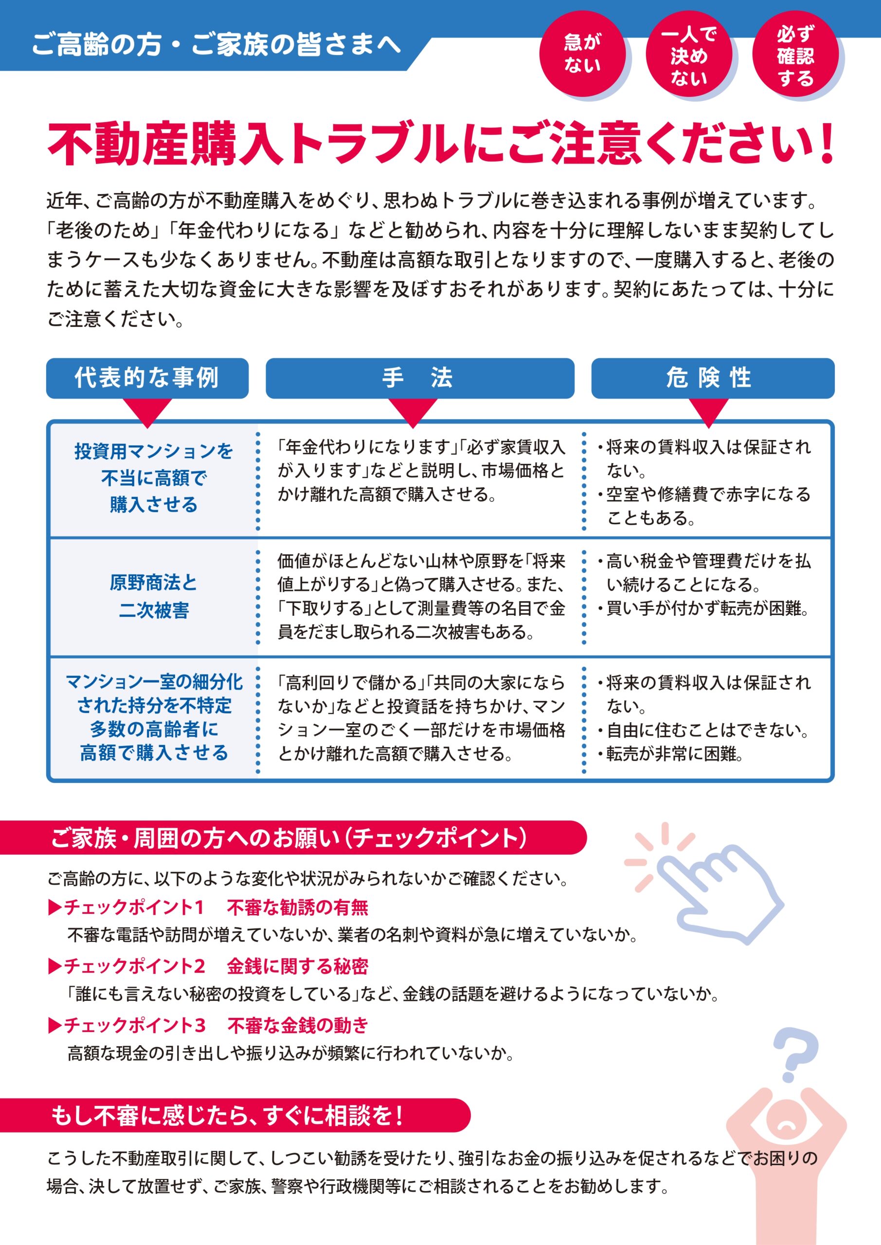 お知らせ 不動産購入トラブルにご注意ください! ・近年、ご高齢の方が不動産購入をめぐり、トラブルに巻き込まれる事例が増えています。本会では、被害を未然に防ぐことを目的として、注意喚起チラシを作成しました。 ・不審な電話や訪問が増えていないか、あやしい金銭の動きがないか等、ご家族の方にご注意いただきたいポイントをまとめています。 ★PDFでの閲覧はこちら★ 不動産購入トラブルにご注意ください!